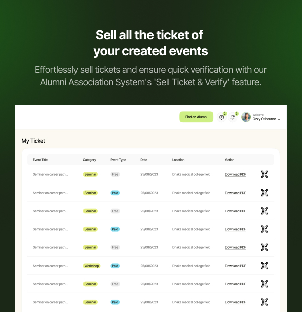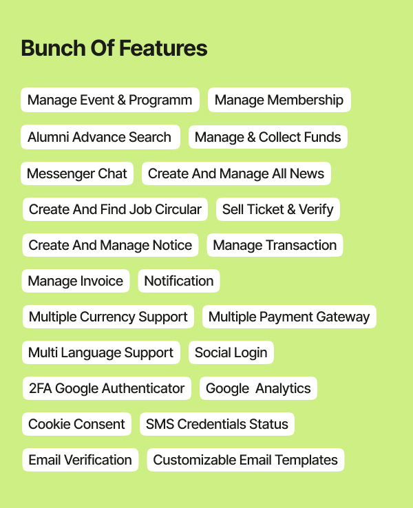 A user-friendly system that helps alumni easily connect and manage there activities. It has a nice design and strong security, including Two-Factor Authentication for extra safety. Alumni can sign up and get approved by submitting the necessary documents, which allows them to join the alumni community. They can share updates and talk with other alumni in the community hub. Planning events is made simple with automatic ticketing using QR codes and barcodes. The system can work with different languages and currencies and keeps everyone informed through email notifications. Security is important, and administrators can easily control the system with a powerful dashboard. There are also features for flexible membership plans, posting job listings, one-to-one private messages, tracking transactions, and using different payment options. Overall, It makes alumni engagement and management easy and comprehensive.