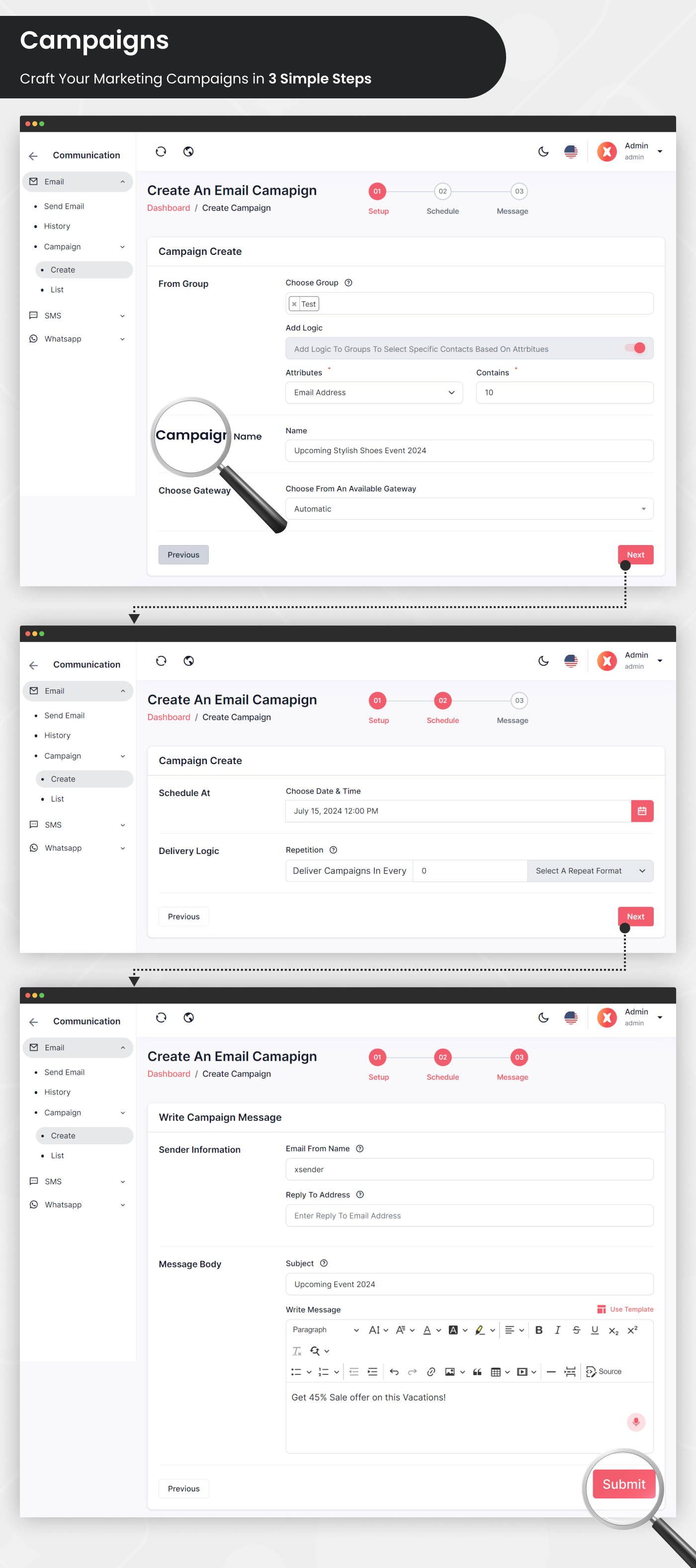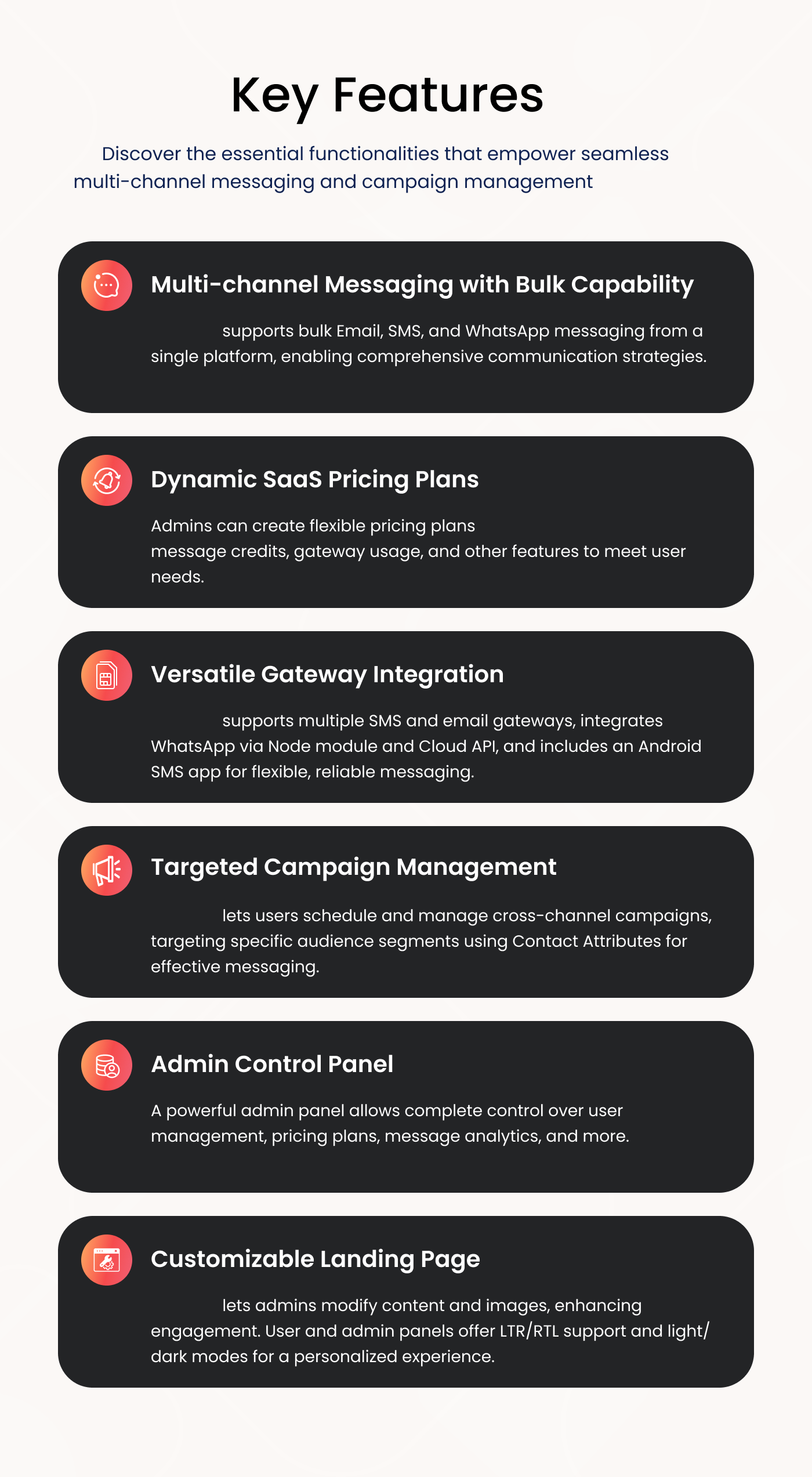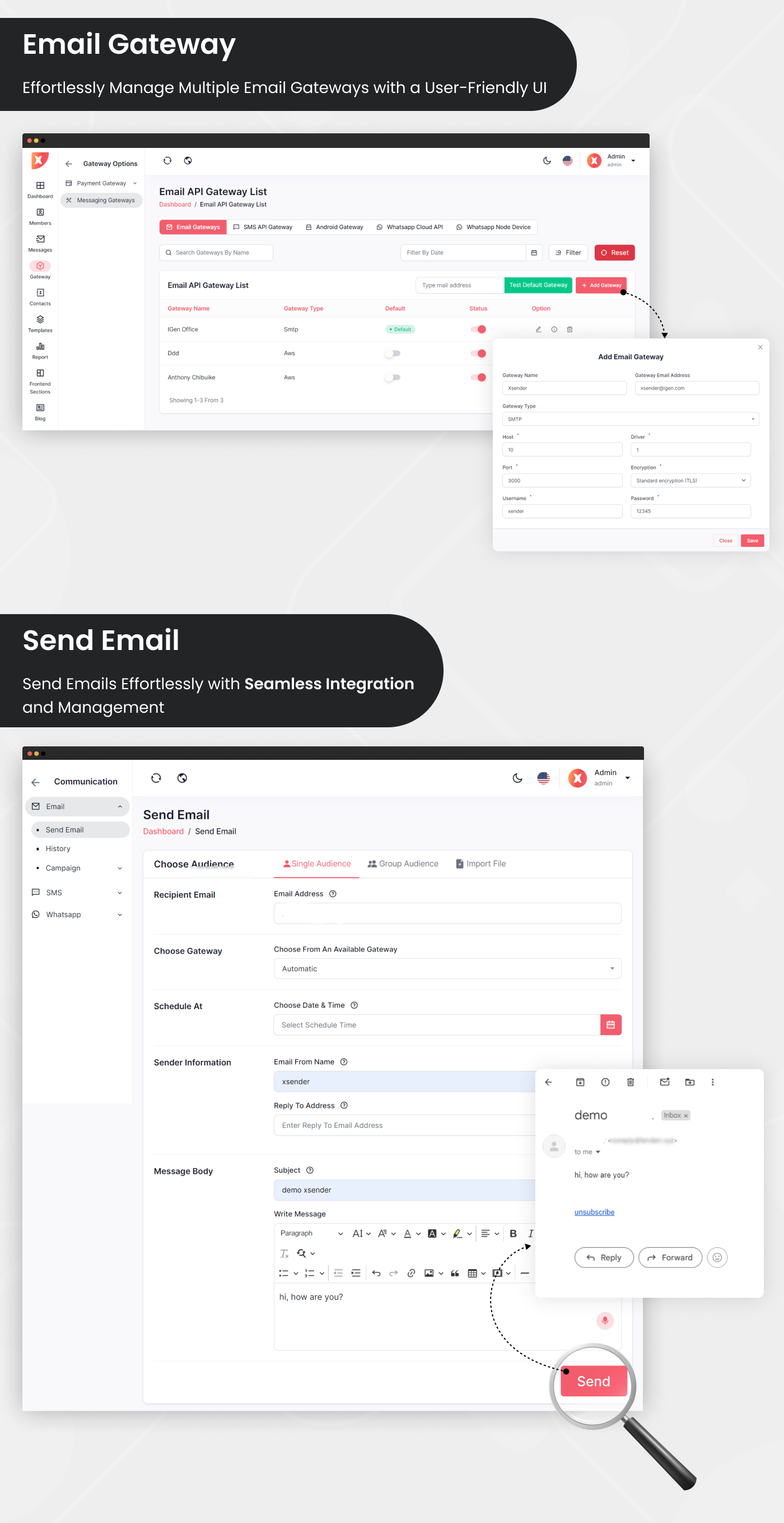 The Web Application sends bulk Emails through SMTP, PHP Mailer, Send Grid API, and also sends mass SMS via Android device using SIM and SMS API Gateway. Also, You can send mass WhatsApp(QR/CloudAPI) messaging, SMS and Email as a promotional campaign or others.