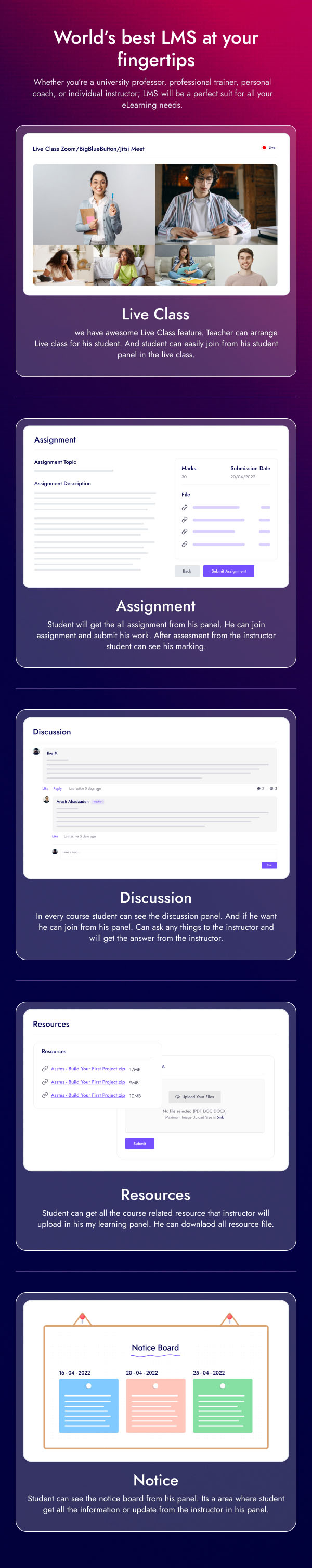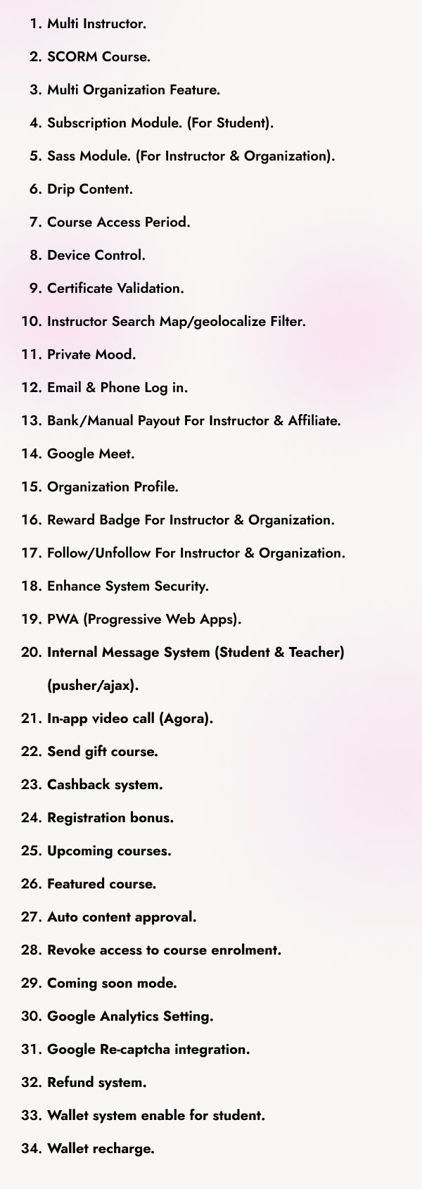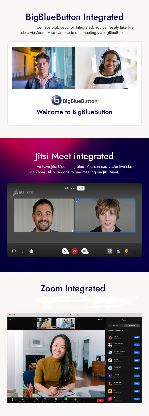 Multiple content support: It supports multiple content types such as video courses, live classes (Zoom)