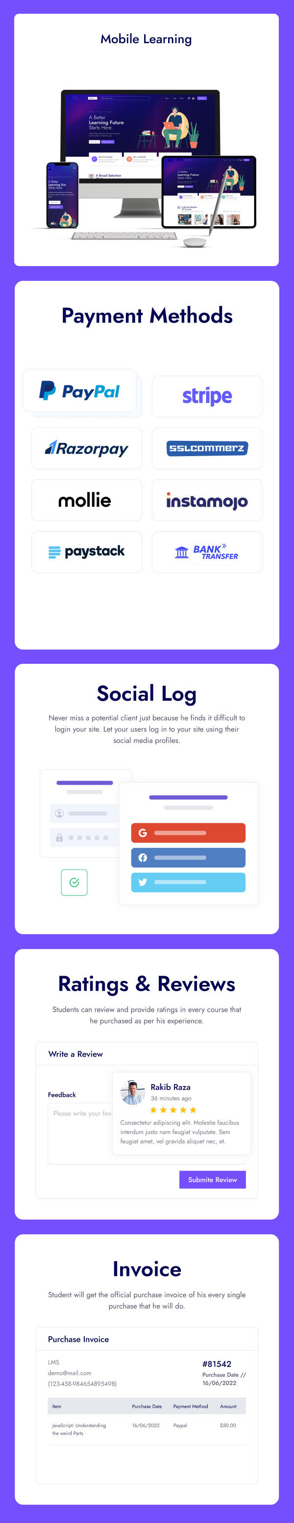 Payment gateways (4 Included): There are 4 gateways supported for different countries. Paypal, Stripe, Razorpay, SSLCOMMERZ.