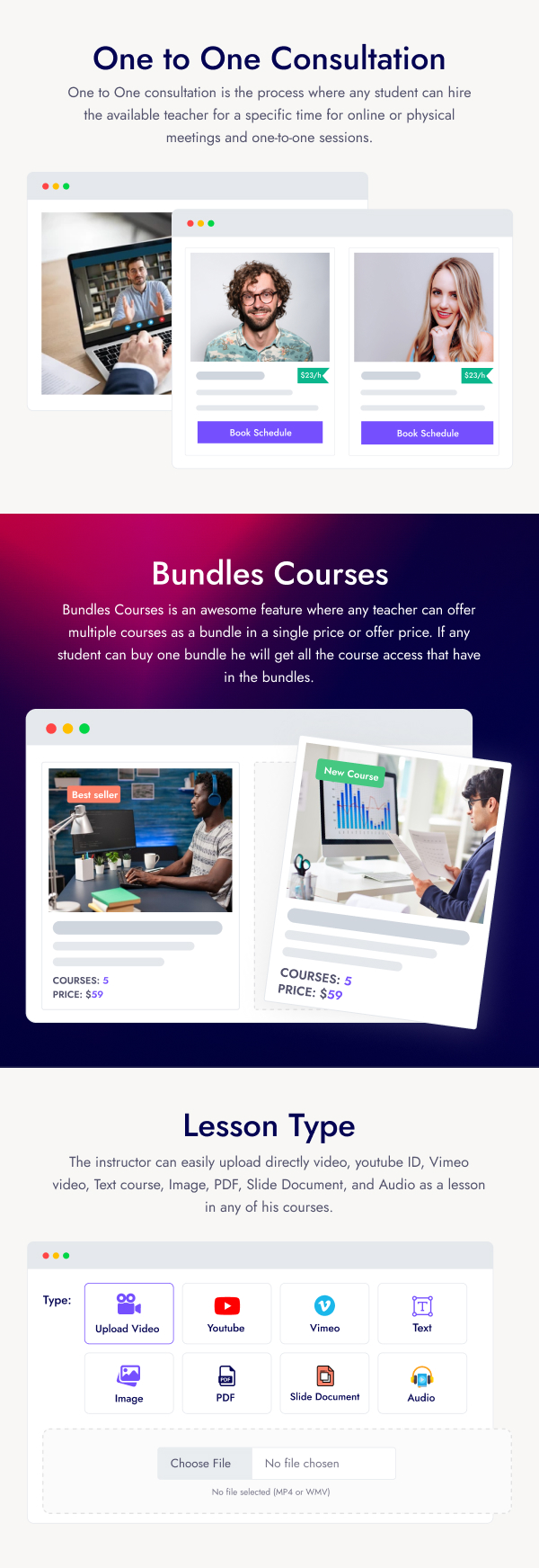 Youtube & Vimeo & AMAZON AWS S3 support: You can use viedeo upload, AWS S3, Vimeo & Youtube video links as course parts so they could be used as free and safe video storage.