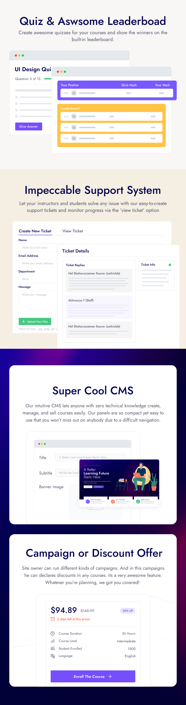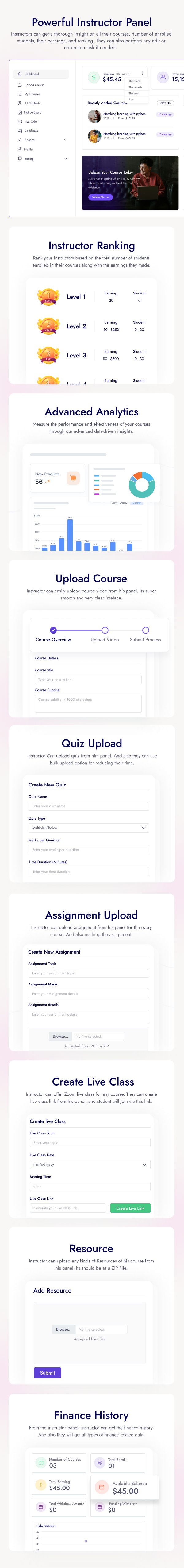 Instructors can get ranking level badge (sell and student enrolled rules), its control by admin. Create unlimited quizzes, assignments and certificates and assign them to the courses.