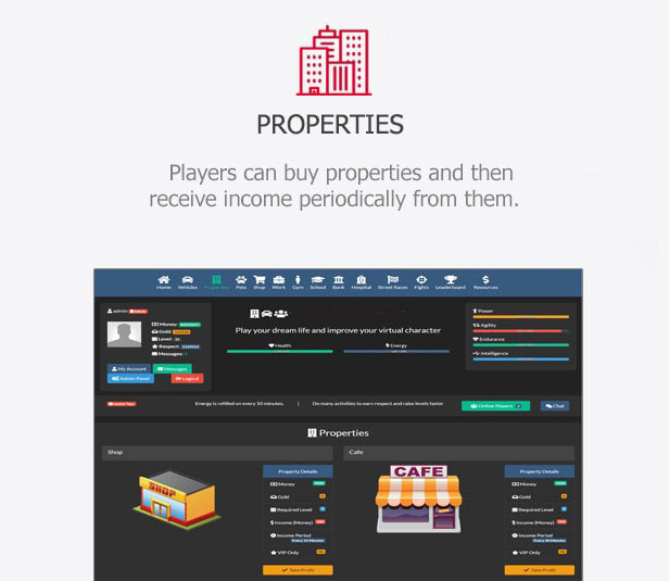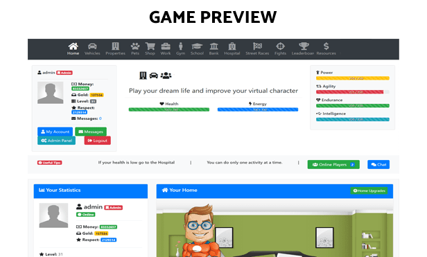 This is online browser game that is developed with the latest web technologies. It is multifunctional game that will help you to create your own online browser game to your choice because it has many options and settings by which you can modify and create your desired browser game. It can be easily customized to fit your needs and will help you to create the most respected virtual life game in the world.