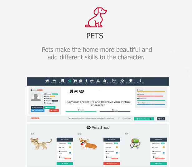 Players can buy properties and then receive income periodically from them. - Pets