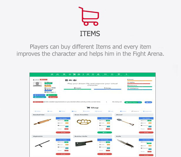 Players can buy different Items and every item improves the character and helps him in the Fight Arena. - Work
