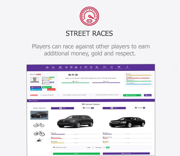 Players can race against other players to earn additional money, gold and respect. - Fight Arena