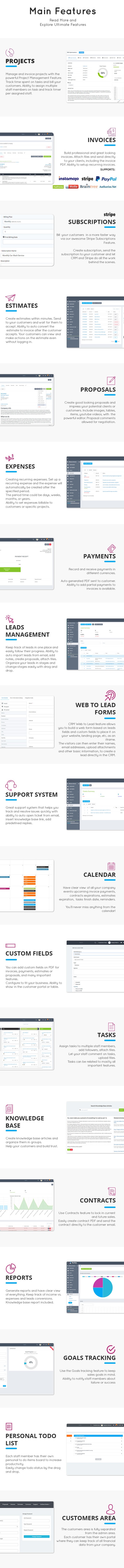 - Follow ups, reports, notes, files and many more features.