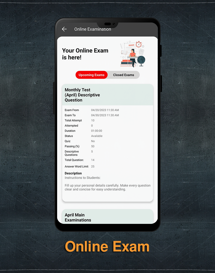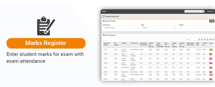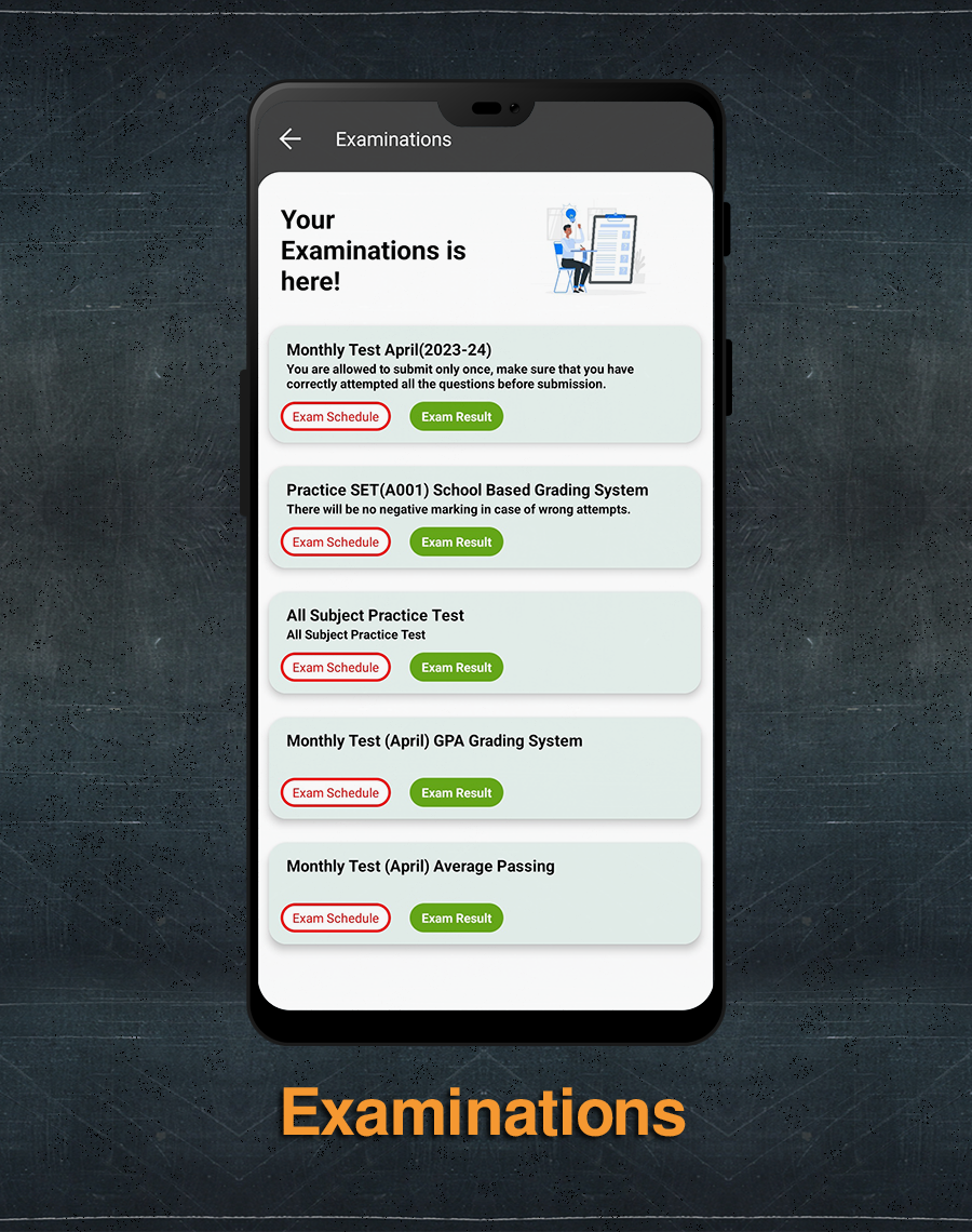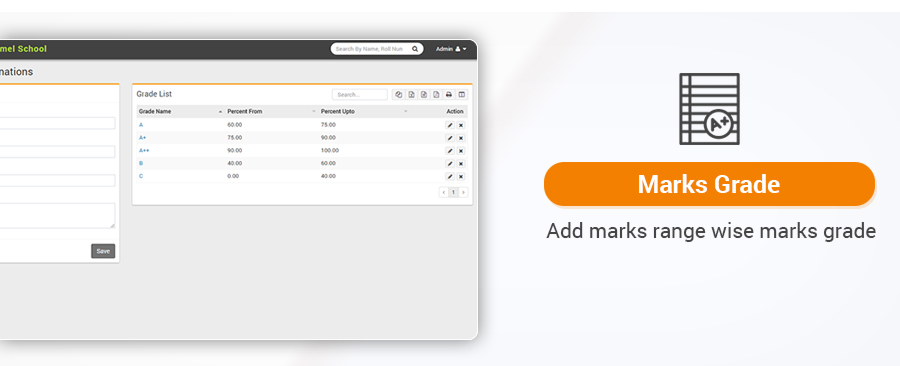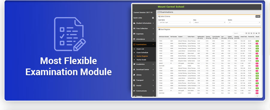 - Complete examination management from exam create to exam schedule to marks entry to progress report with grades.
