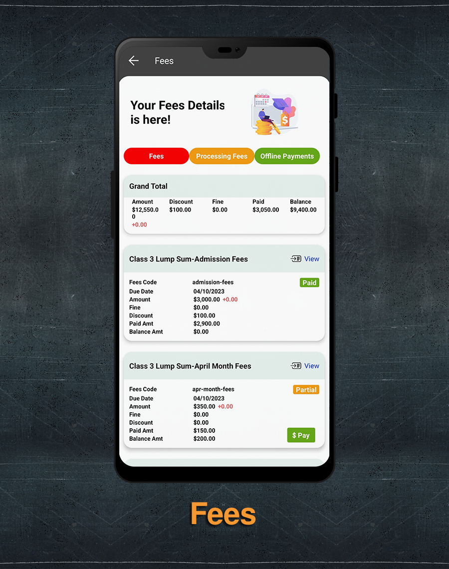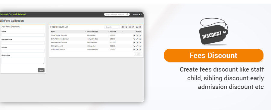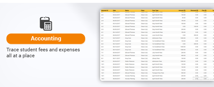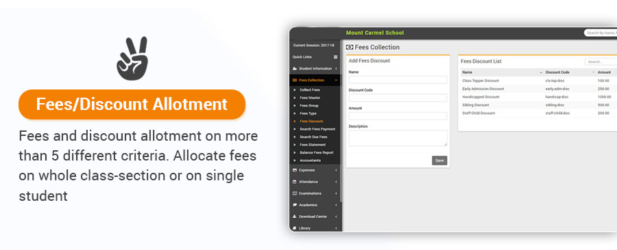 - Most advanced fees collection mechanism to adopt any type of fees structure including fees type, fees groups, fees masters, free hand fees (2.2.0), due date, fine, discount, fees and discount allotment on more than 5 different criteria. State of the art fees collection page. Various fees reports.