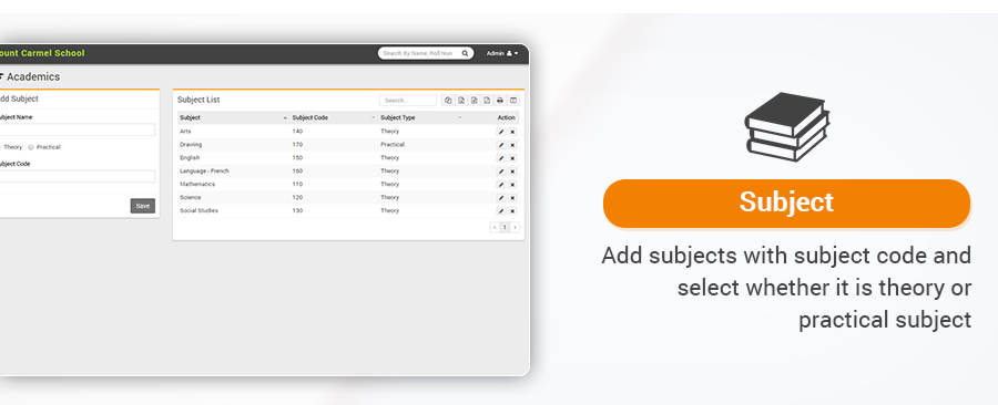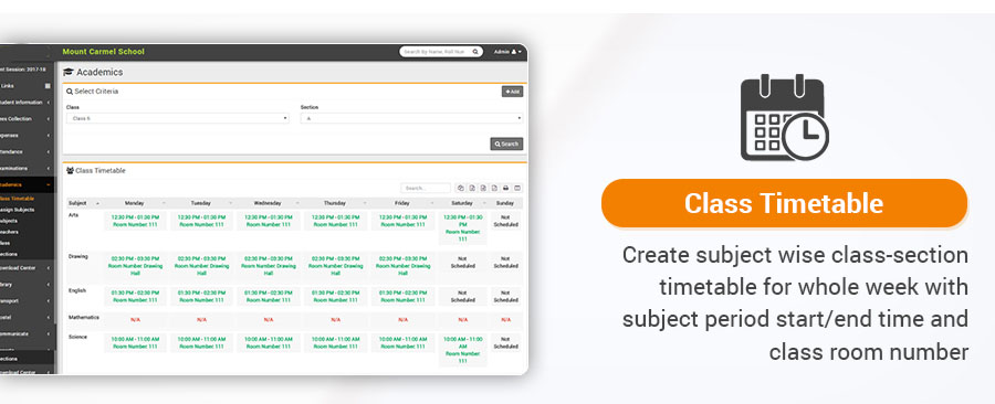 - Manage classes, section subjects, teacher, assign subject and create class timetable.