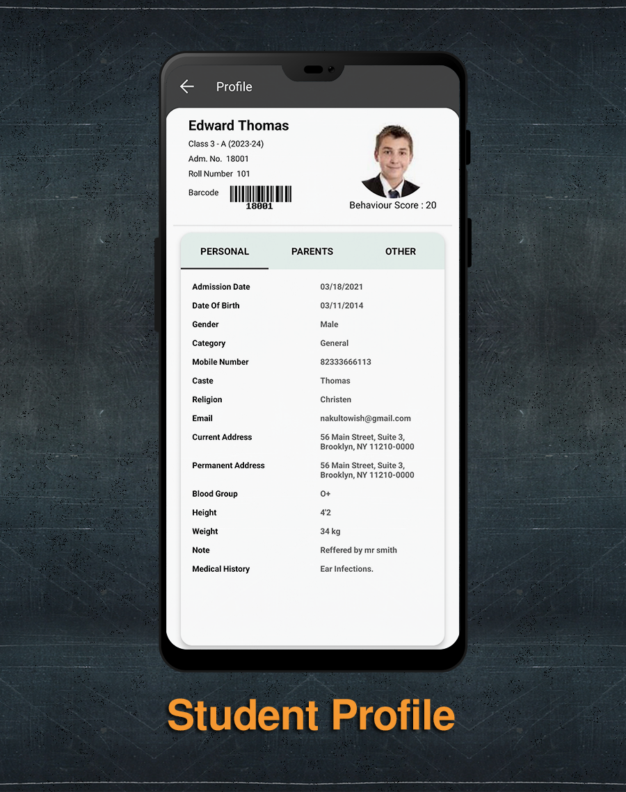 - Student profile consist 360* student record with admission, personal, contact, fees, exam and document details.