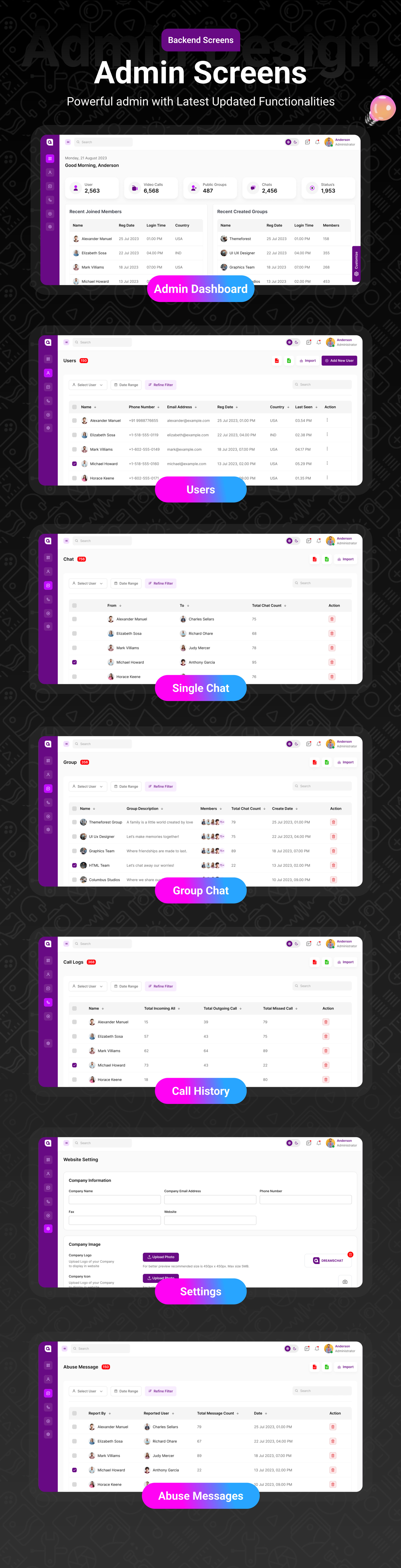 Administrator can configure the App common details/pages and view & monitor the user activities, block users/groups, delete messages.